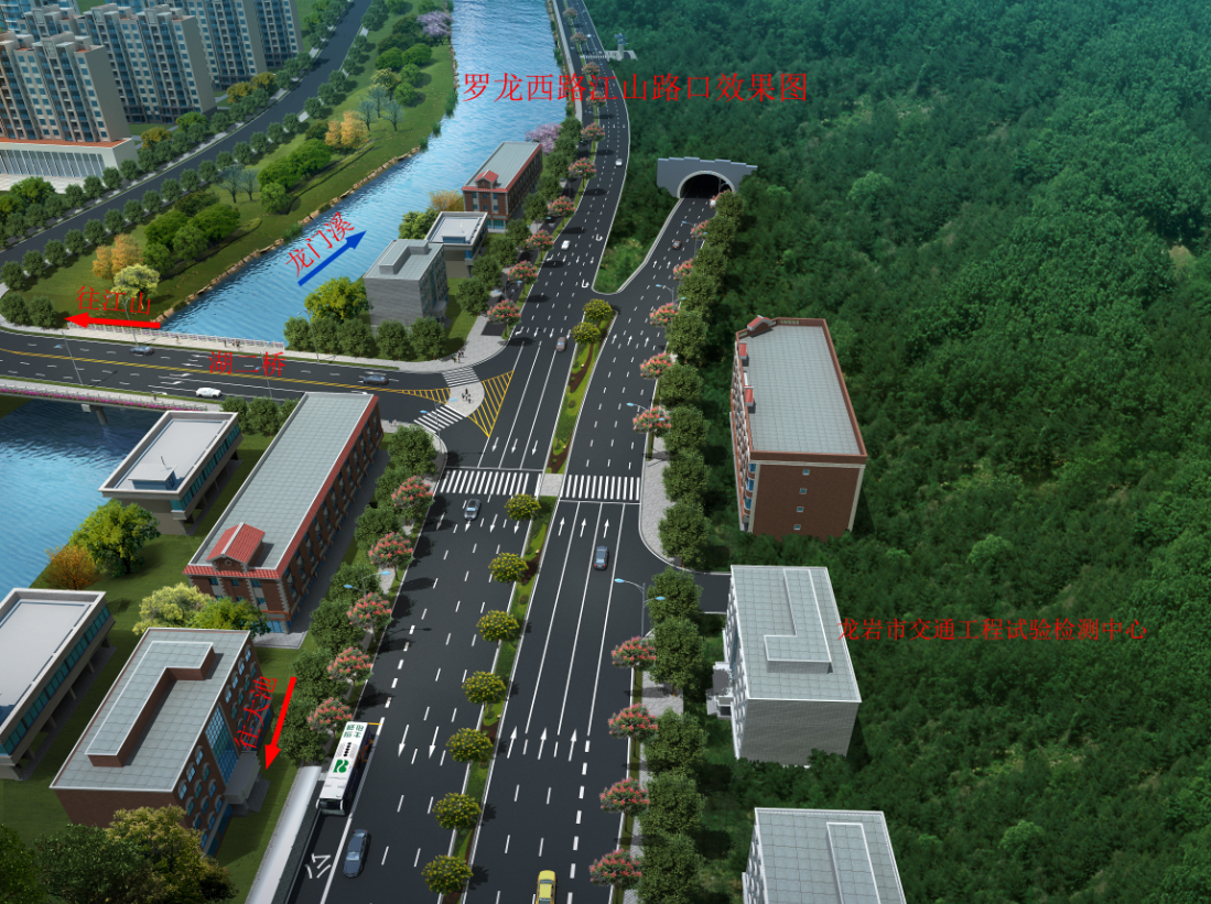 羅龍西路是連接龍巖西高速出入口與中心城市的唯一通道,其規(guī)劃改造范圍從紅竹山橋至御佳園路口,全長3855米,計(jì)劃將原道路拓寬至40米,實(shí)行雙向六車道,兩旁設(shè)2.5米非機(jī)動車道,并在湖二橋路口以東設(shè)640米入城單向三車道隧道連接至御佳園路口,原羅龍西路湖二橋至御佳園段將調(diào)整為出城單向車道。